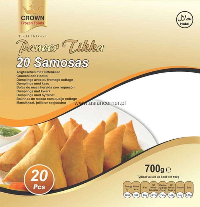 Paneer Tikka Samosa, samosa to popularny street food w Indiach. Samosa fusion z kostkami paneer tikka nadziewanymi na arkusze ciasta i maczanymi w gorącym oleju do uzyskania chrupiącej i złocistej barwy. Podawany z ostrym chutneyem z zielonej mięty.